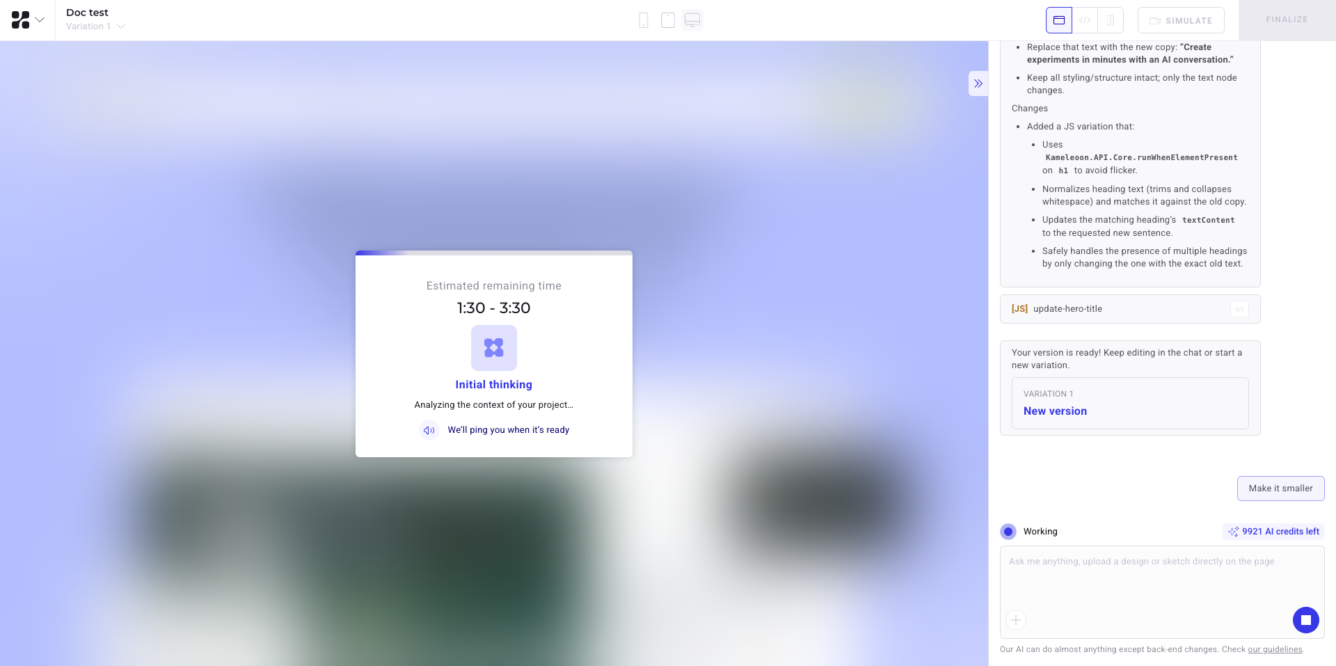Depending on your prompt, Kameleoon AI may ask for more details or confirmation before applying changes.