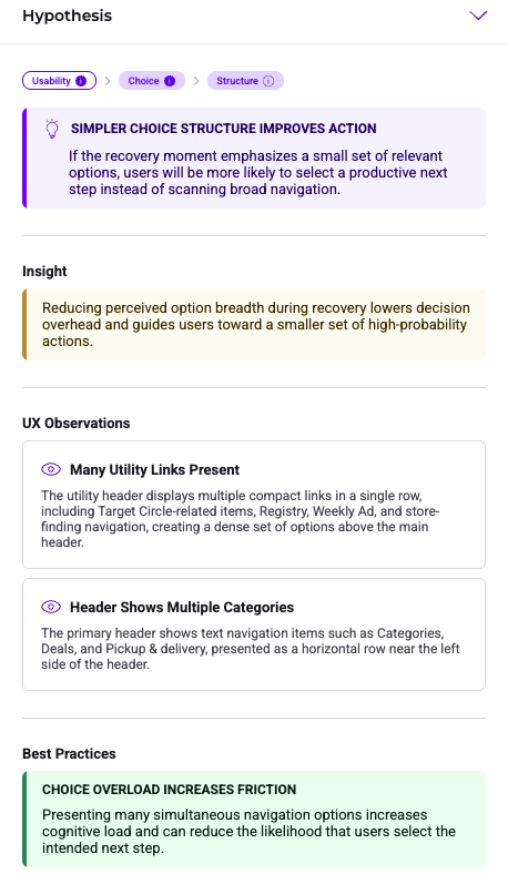 - UX Observations: Lists specific elements on your page that triggered the recommendation.