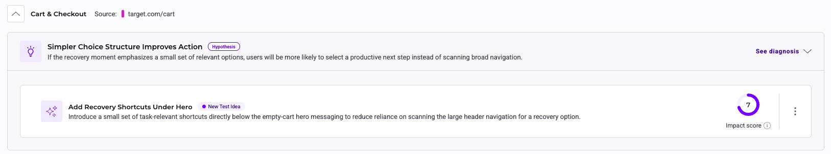 To help you decide which tests to launch first, every idea is assigned an Impact Score. Powered by Confidence AI, the Impact Score represents the likelihood of the test producing a meaningful conversion lift, allowing you to focus on high-impact opportunities.