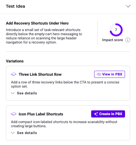 PBX Ideate transforms identified friction points into specific, actionable optimization hypotheses and test ideas.