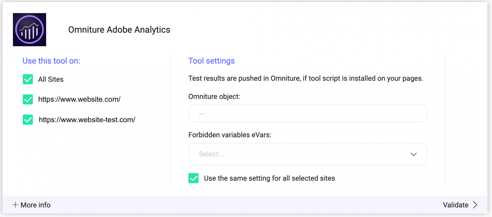Once you have configured the tool, click Validate. You will see an ON toggle displayed on the right of the tool's line, and the number of projects on which the tool is configured.