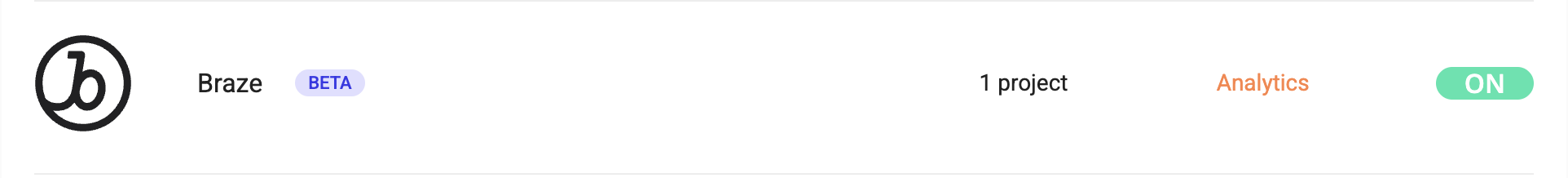 You will see an ON toggle on the tool's card and the number of projects Braze is configured on.