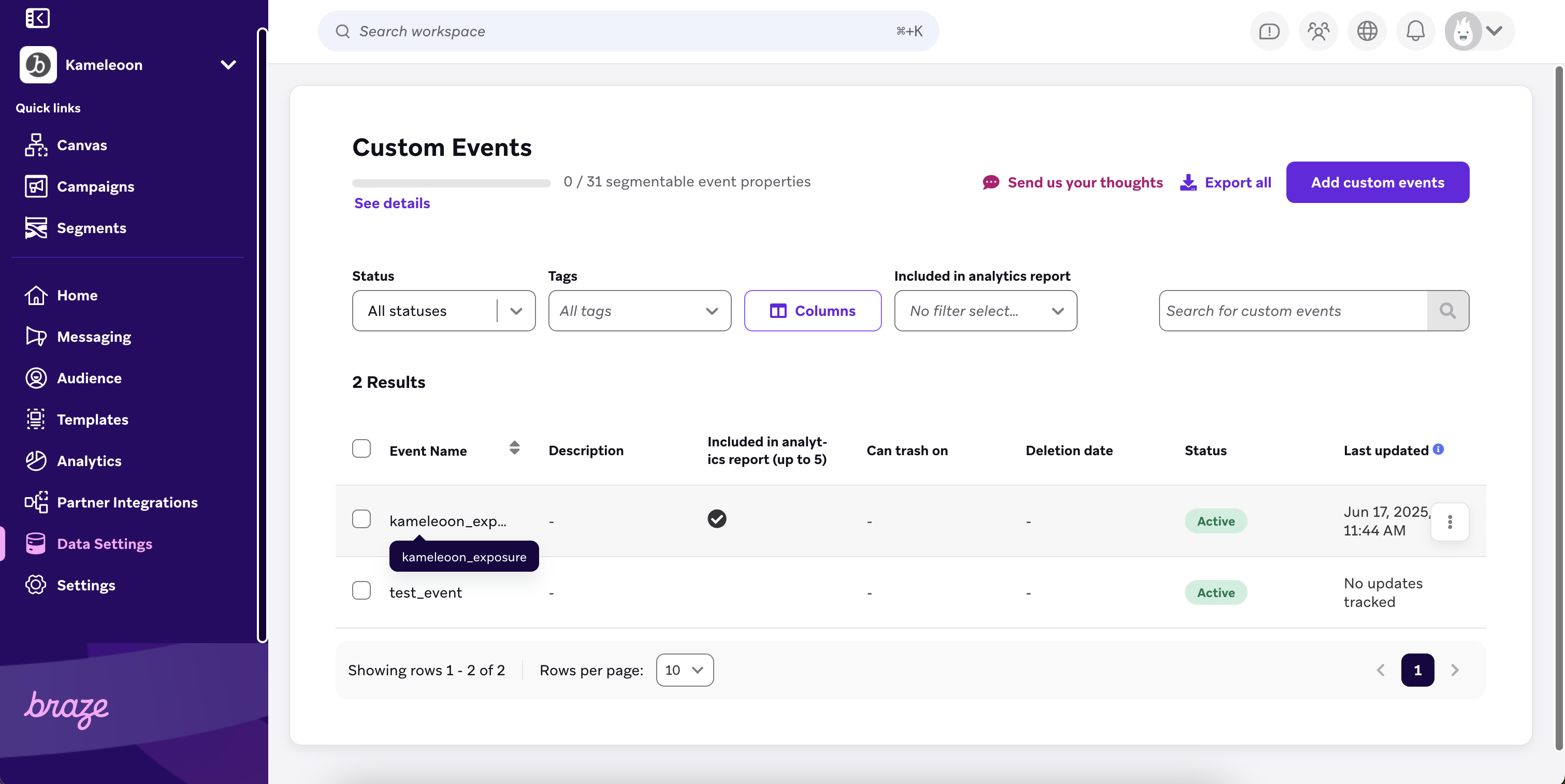 Kameleoon will send custom events with properties, such as experiment name, experiment ID, variation name, and variation ID to Braze.