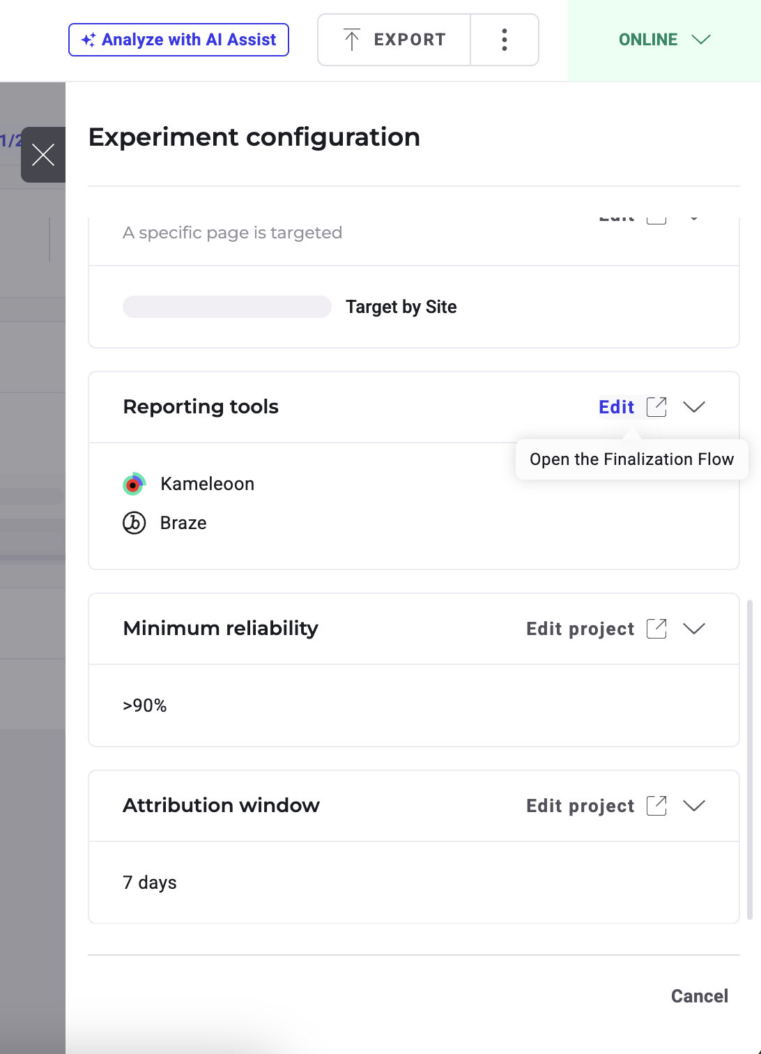 Once Braze is set as a reporting tool for an experiment, you can select (or deselect) it via the Kameleoon Results page.