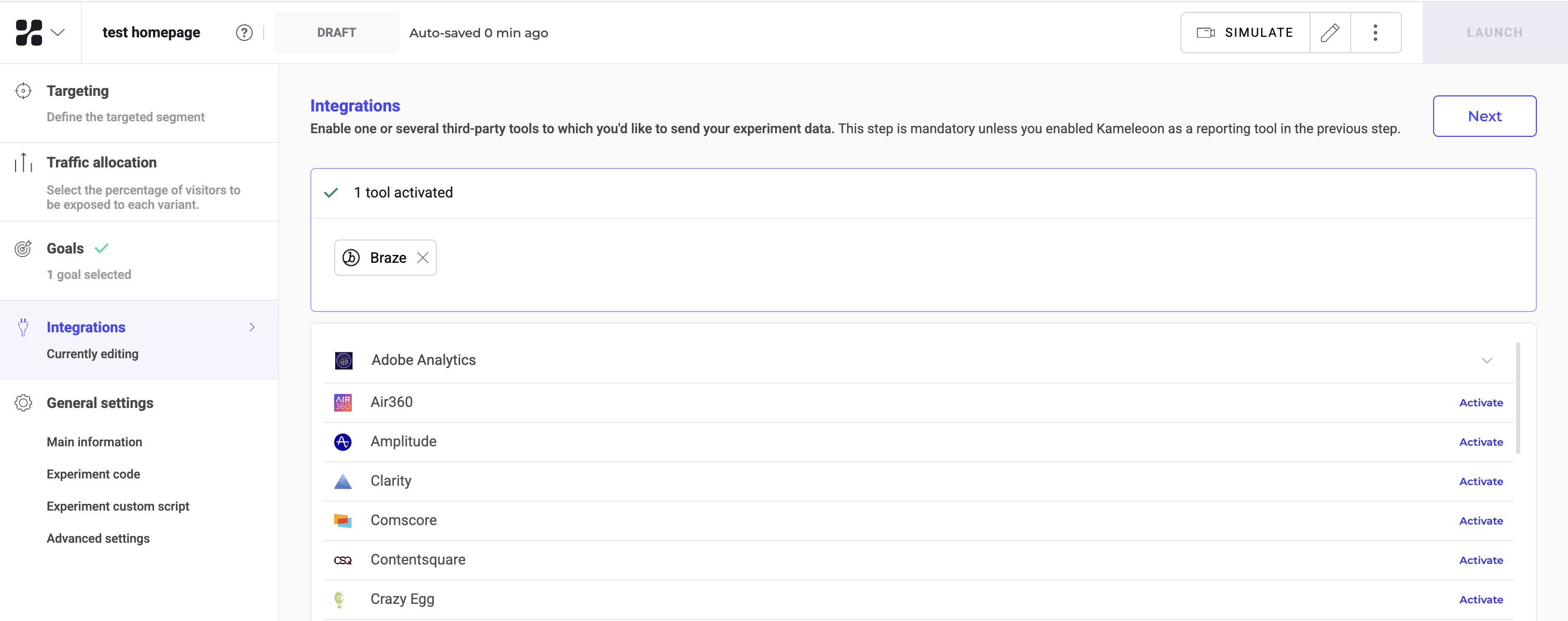 When finalizing your experiment, click Integrations to configure Braze as a tracking tool. Select Braze.