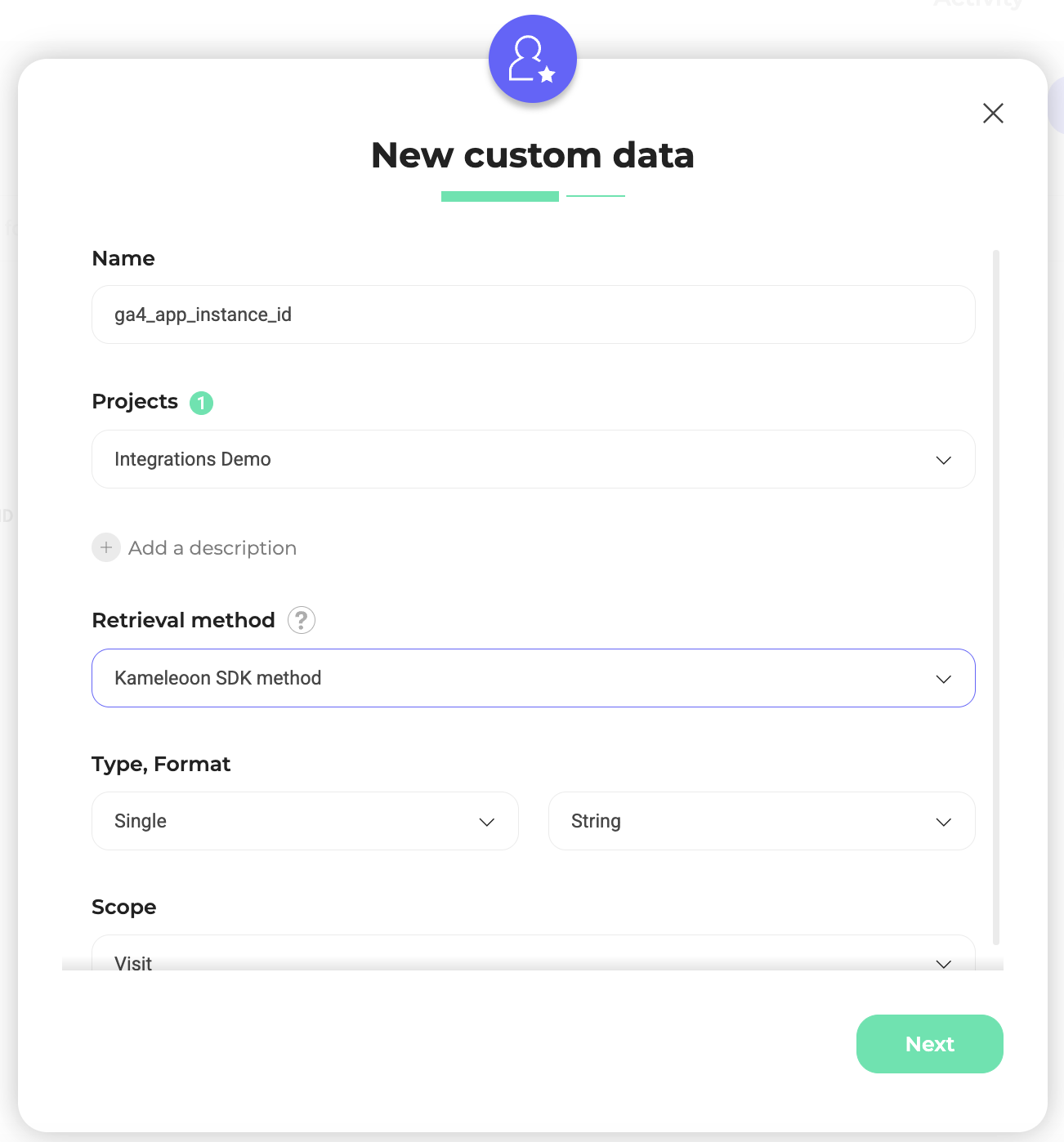 Next, use the Kameleoon SDK to set your ga4_app_instance_id custom data to this value, ensuring you use the correct index for the ga4_app_instance_id custom data, which you can find in the Kameleoon interface.