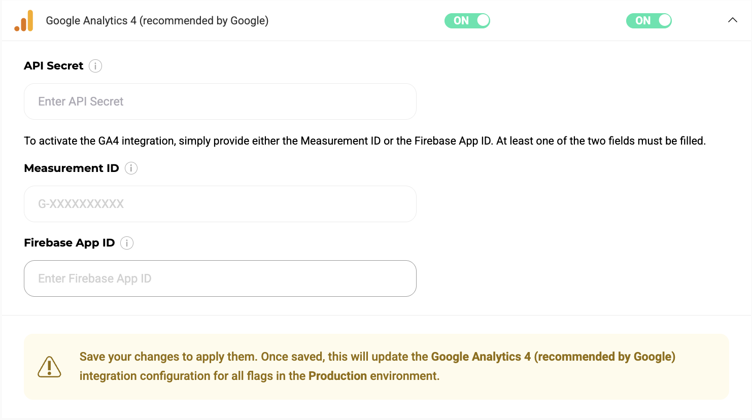 Set up the integration in the feature flag environment under the Integrations section. Enable it for each environment where you want it to be active.