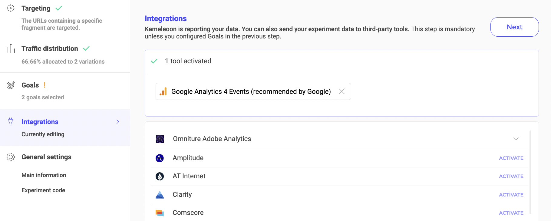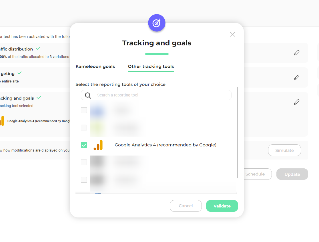 Once Google Analytics 4 is set as a reporting tool for an experiment, you can select (or deselect) it via the Kameleoon Results page. To do this: