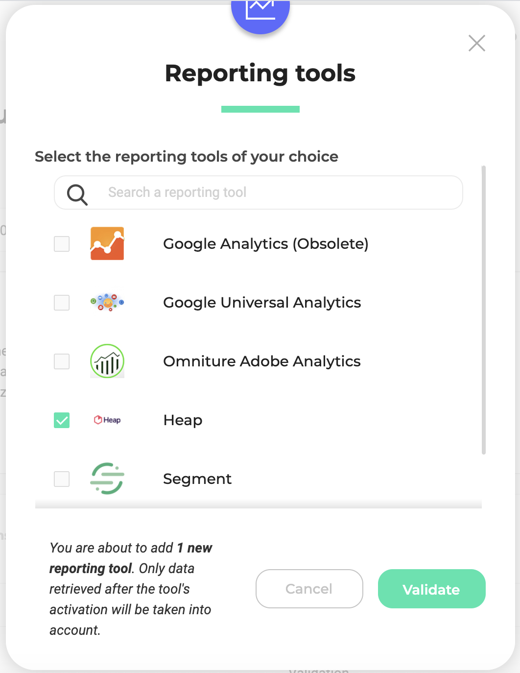 Once Heap is activated on the Integrations page, you can select it as a reporting tool at the Integrations step of the finalization panel.