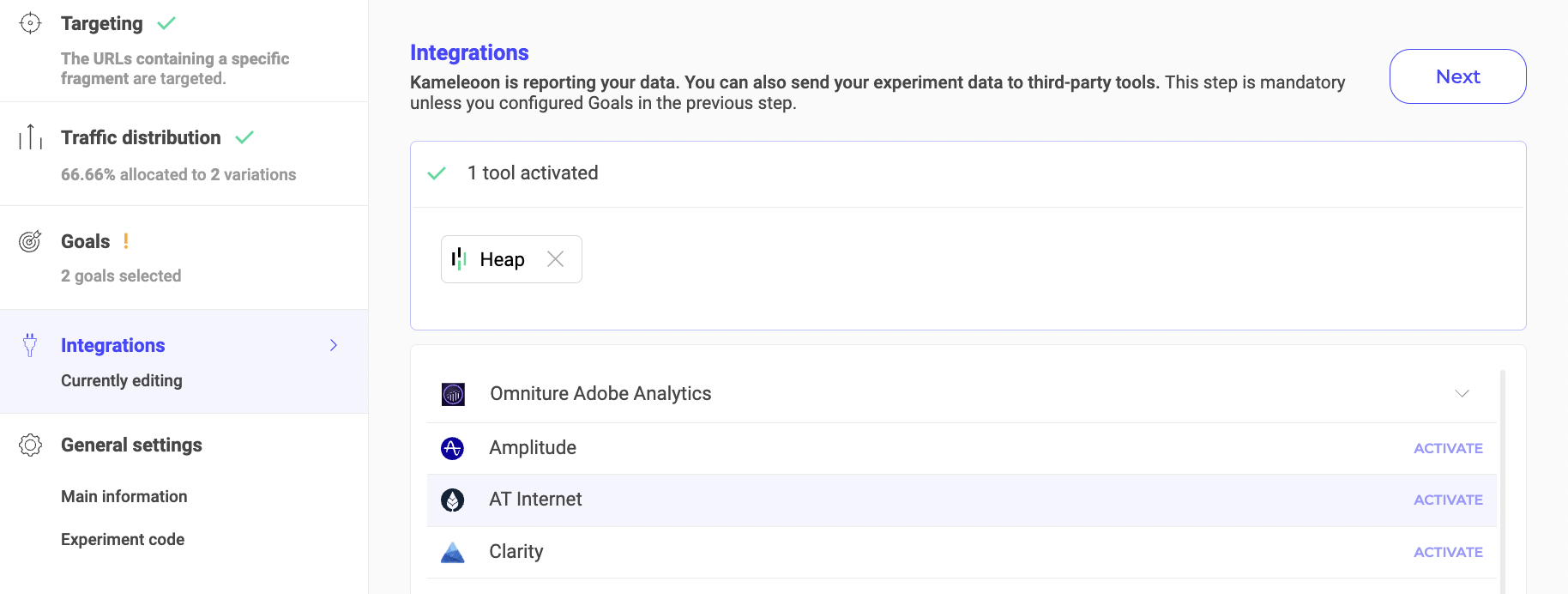 To use Heap, the first step is to activate it on the Kameleoon Integrations page: