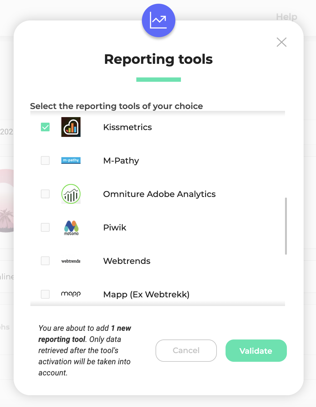 To use Kissmetrics, you must activate it in the Kameleoon Integrations page. To do this: