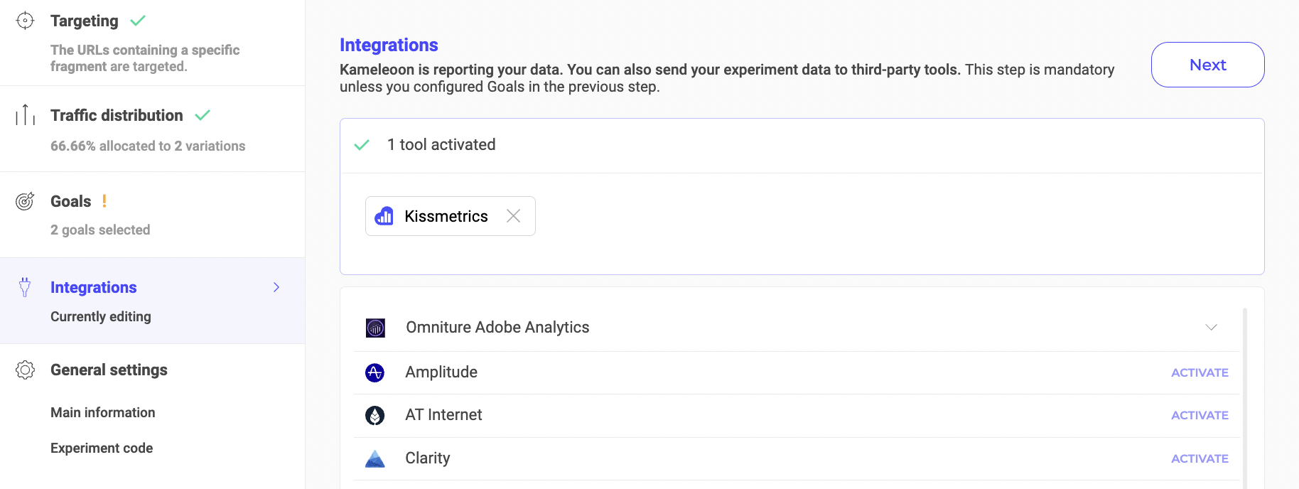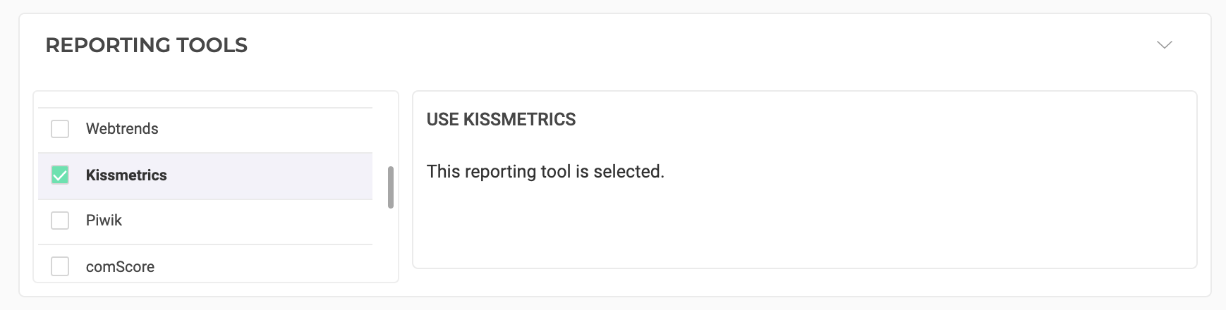 Once Kissmetrics is activated in the Integrations page, you can select it as a reporting tool at the Integrations step in the finalization panel.