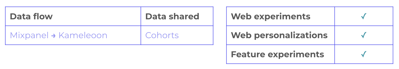 The Kameleoon Mixpanel Cohorts integration automatically exports Mixpanel cohort data into Kameleoon, where it can be used to deliver personalized experiences and run highly targeted experiments, driving more impactful and data-driven optimizations.