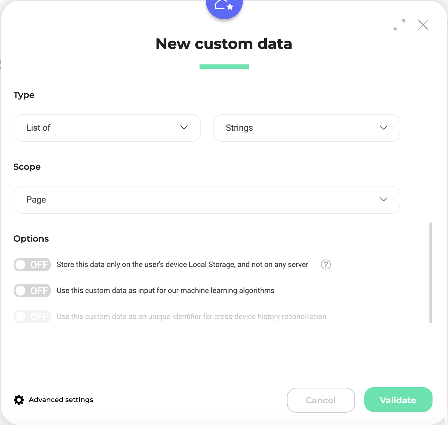 The custom data should be set to the list of and strings types, and the scope may be set to Page, depending on the scope being defined in Mixpanel. When set to Page, data is re-evaluated on every page load if the user belongs to a certain cohort Mixpanel identifies.