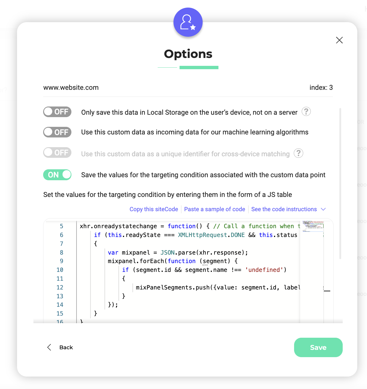 Activate the Save the values for the targeting condition associated with the custom data point option, and insert this snippet into the dedicated field. Replace the value "ADD_YOUR_PROJECT_ID_HERE" by your project sitecode.