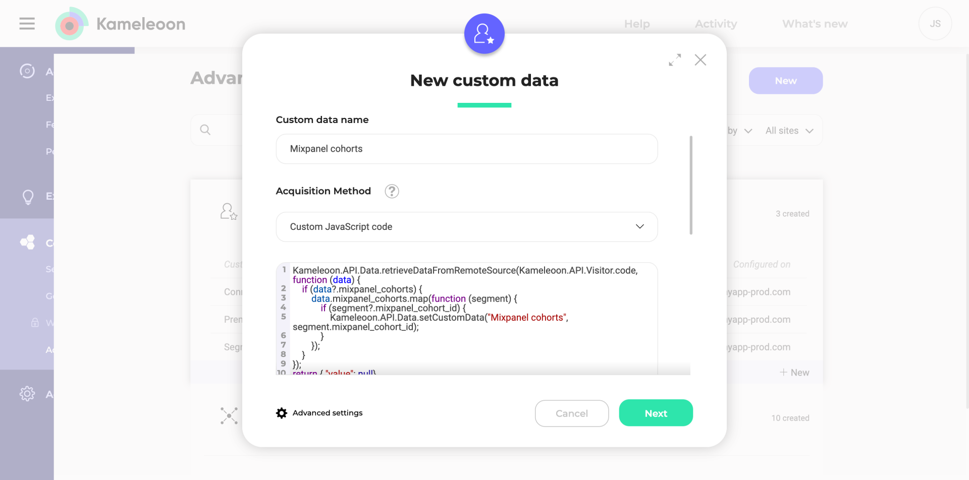 Name your custom data "Mixpanel cohorts" and choose the Custom JavaScript code acquisition method if you're running a classic web experiment, or Kameleoon SDK method if you're running a server-side experiment or using a feature flag.
