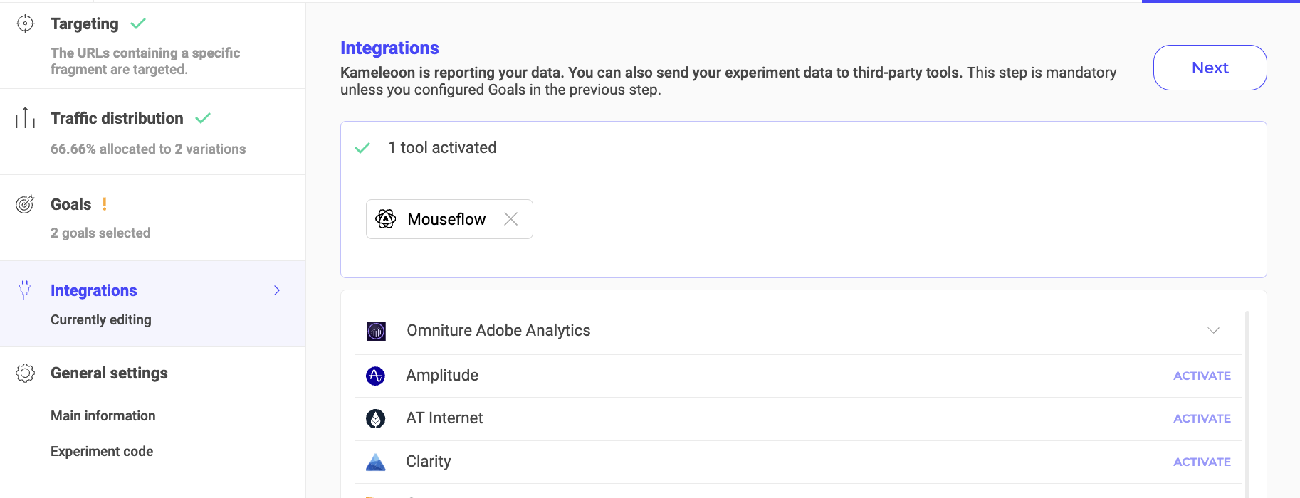 Mouseflow will be mentioned in the summary pop-in before going live. Kameleoon will automatically transmit the data to Mouseflow and you can view your results directly in the tool.