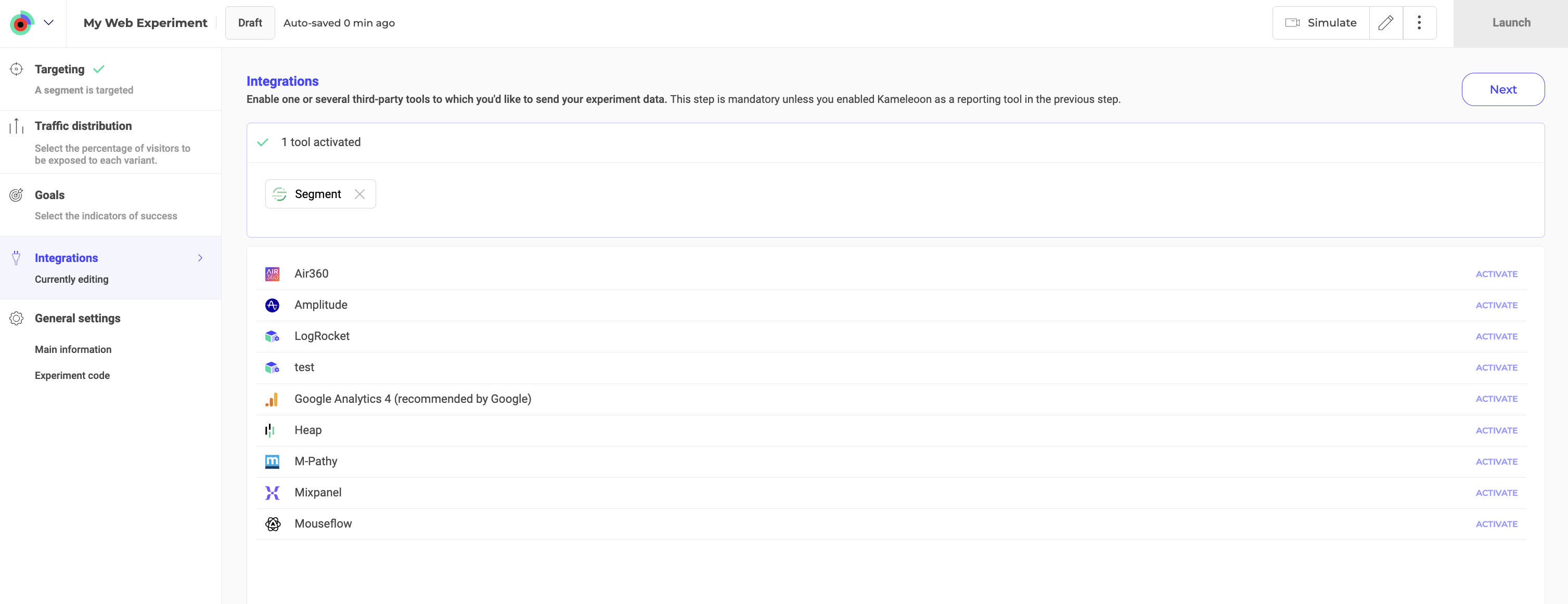 - Effortless setup: Enable third-party integrations directly from the Kameleoon app with no need for custom code or SDK changes.
