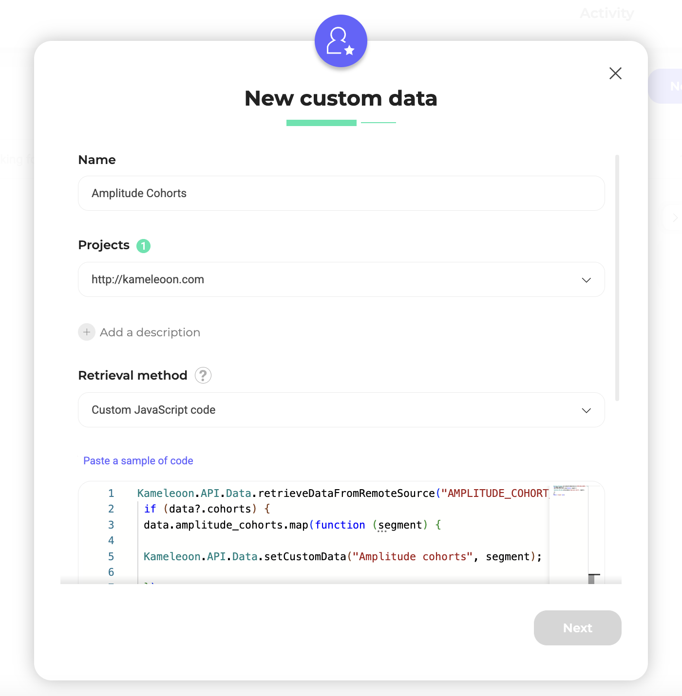 To create a segment based on Amplitude cohorts, set up a custom data in Kameleoon > Configure > Custom data.