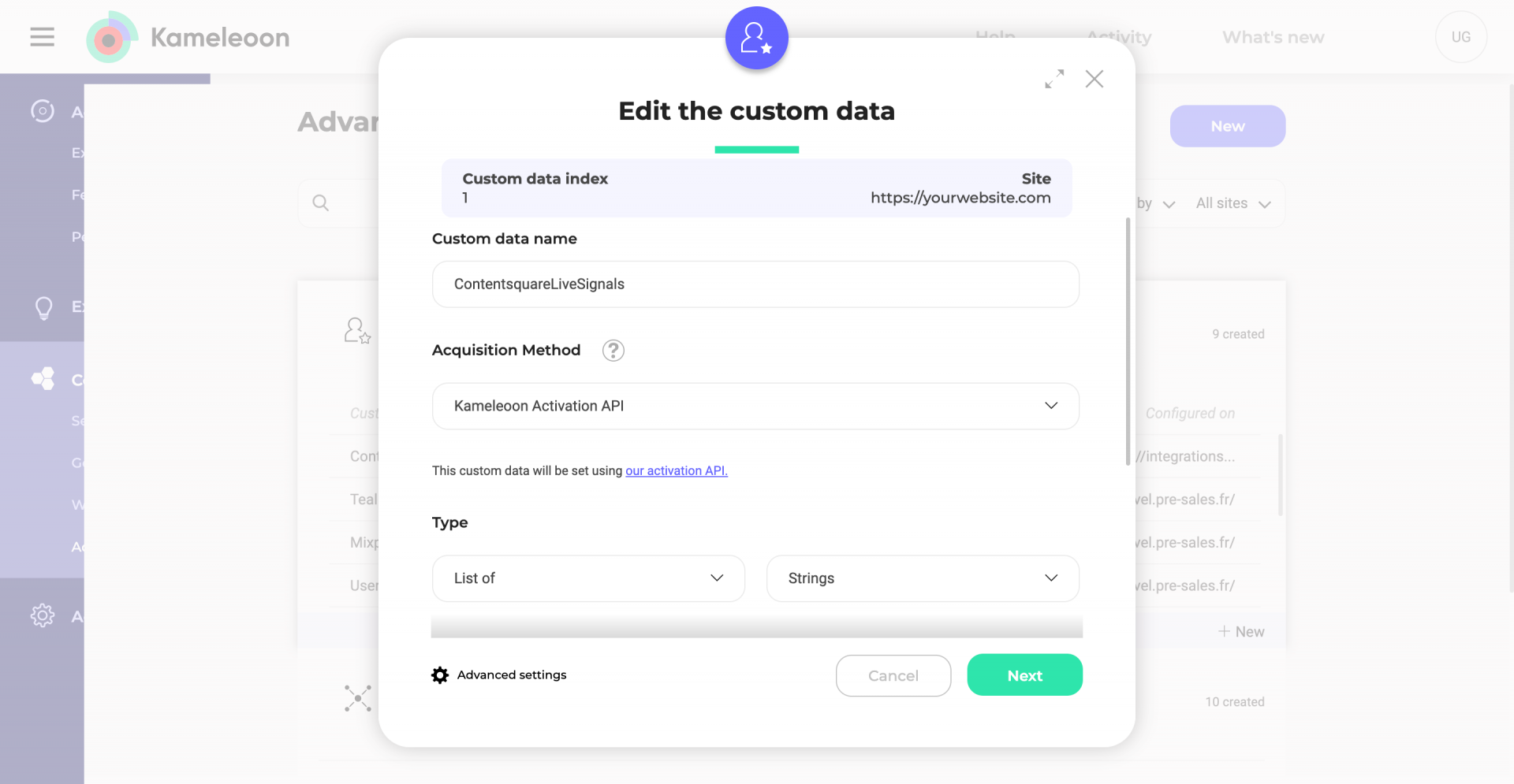 In a nutshell, you will need to create and set up a Kameleoon custom data that Contentsquare will initialize when a live signal is triggered. Follow these steps to set up the custom data: