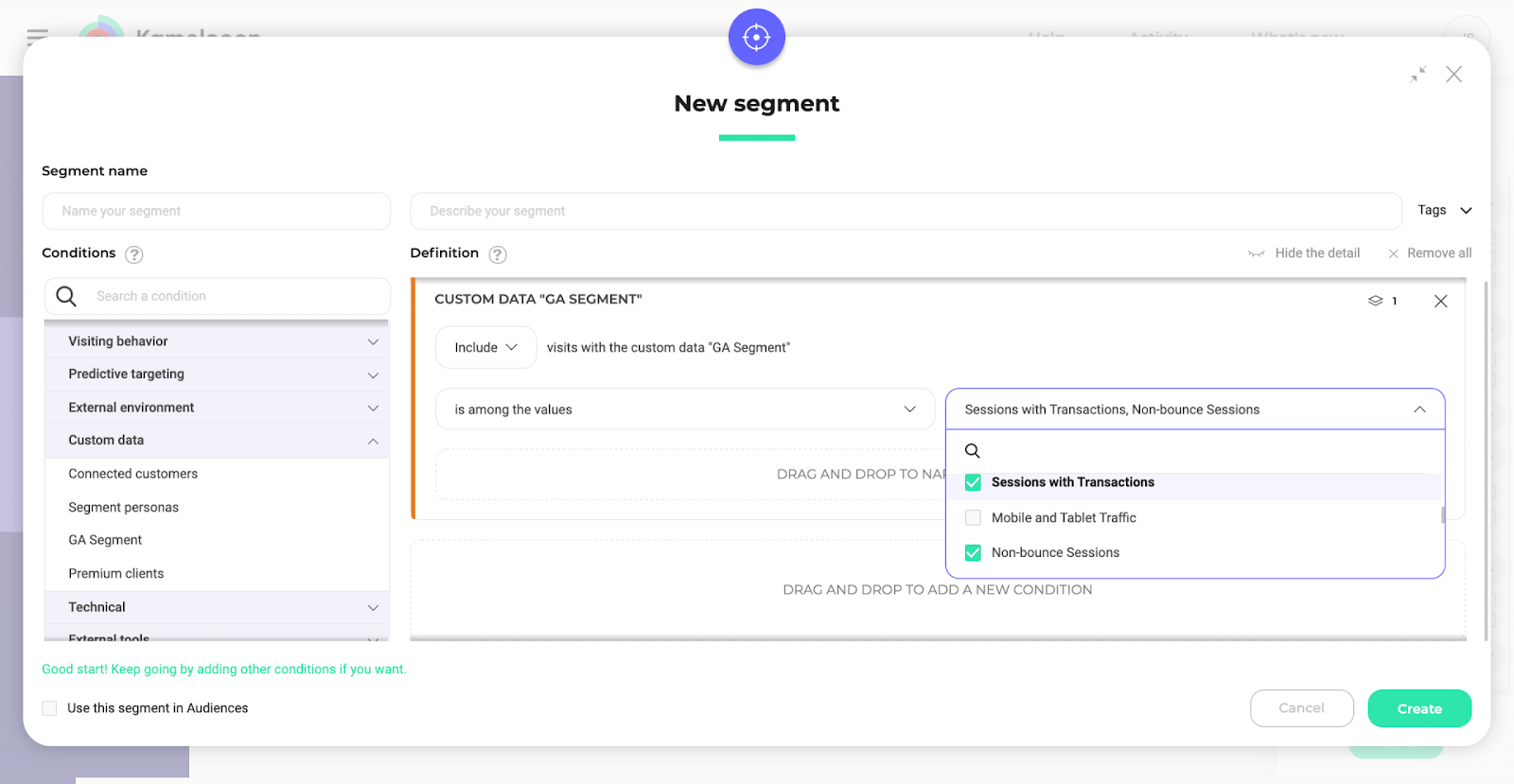 You can now use your GA4 audiences in our Segment builder to target visitors in Kameleoon campaigns by choosing the custom data in our Segment builder and selecting is among the values, which will then show a list of every audience name from GA4.