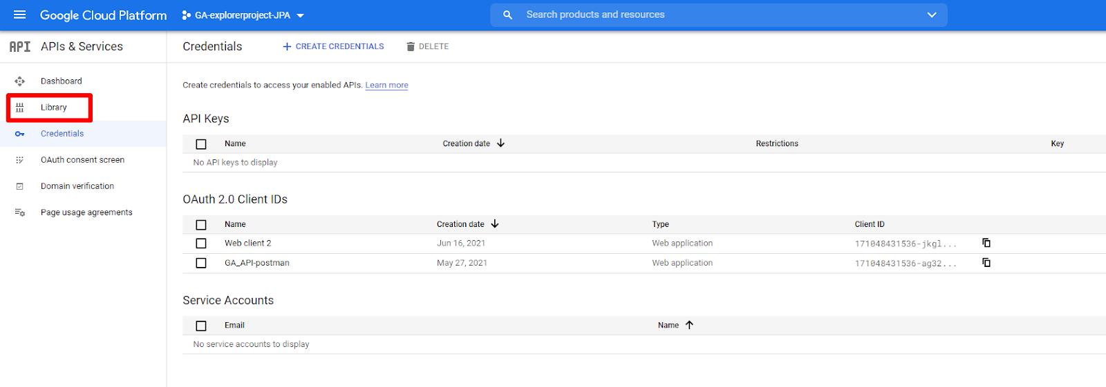 To use any API with a particular email address, it must be activated in Google Cloud Console. First, click Library.