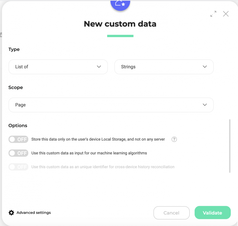 The custom data should be set to the list of and strings types, and the scope can be set to visit or page (when set to page, it is re-evaluated on every page load).