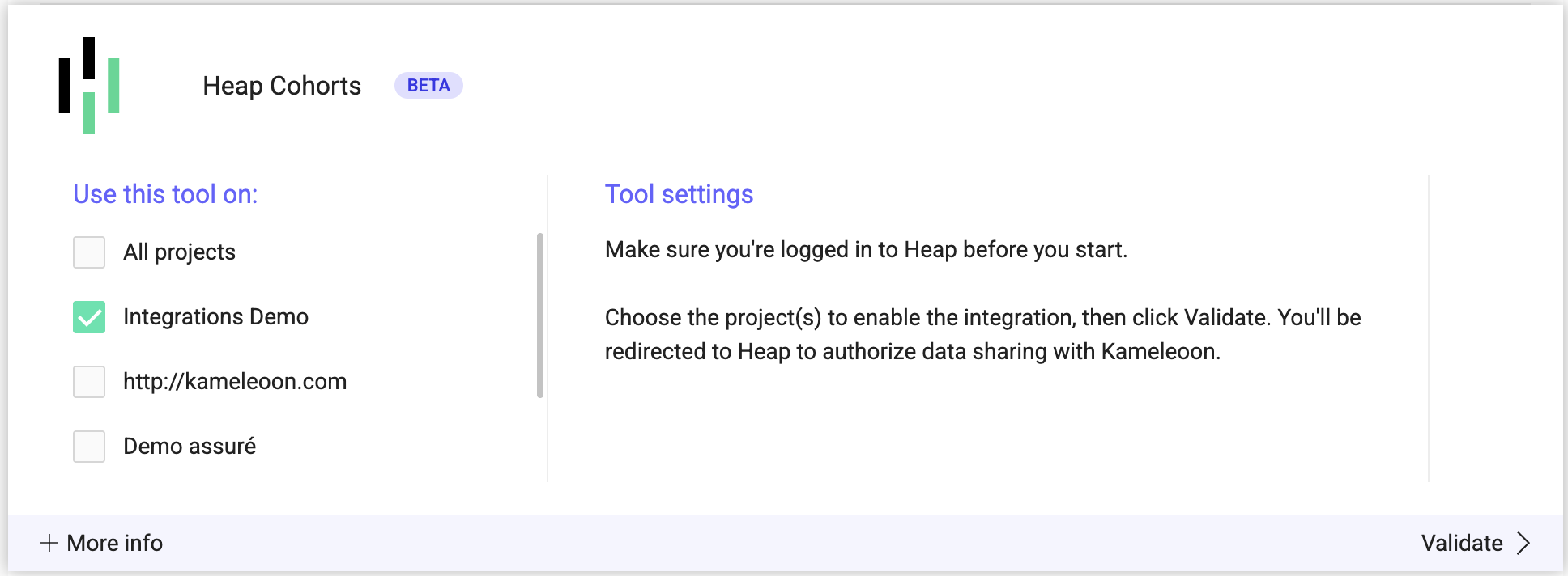 - Select your project(s) and click Validate. Kameleoon redirects you to Heap.