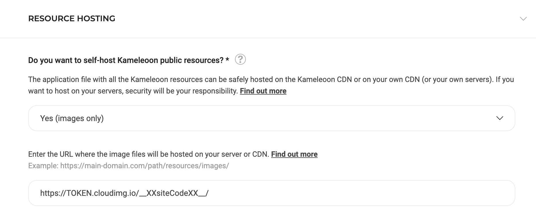 Then in the Resource Hosting section, select Yes (../image Only) and then enter the following URL according to your cloudImage token and to the CloudImage setup: https://TOKEN.cloudimg.io/_XXsiteCodeXX/