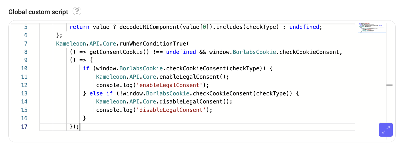 When integrated with your WordPress website, Borlabs Cookie works seamlessly with Kameleoon to read the consent each visitor provides before collecting any data. This integration ensures Kameleoon operates in alignment with the user's consent preferences. For more information on Kameleoon's Consent Management Policy, please refer to this documentation.