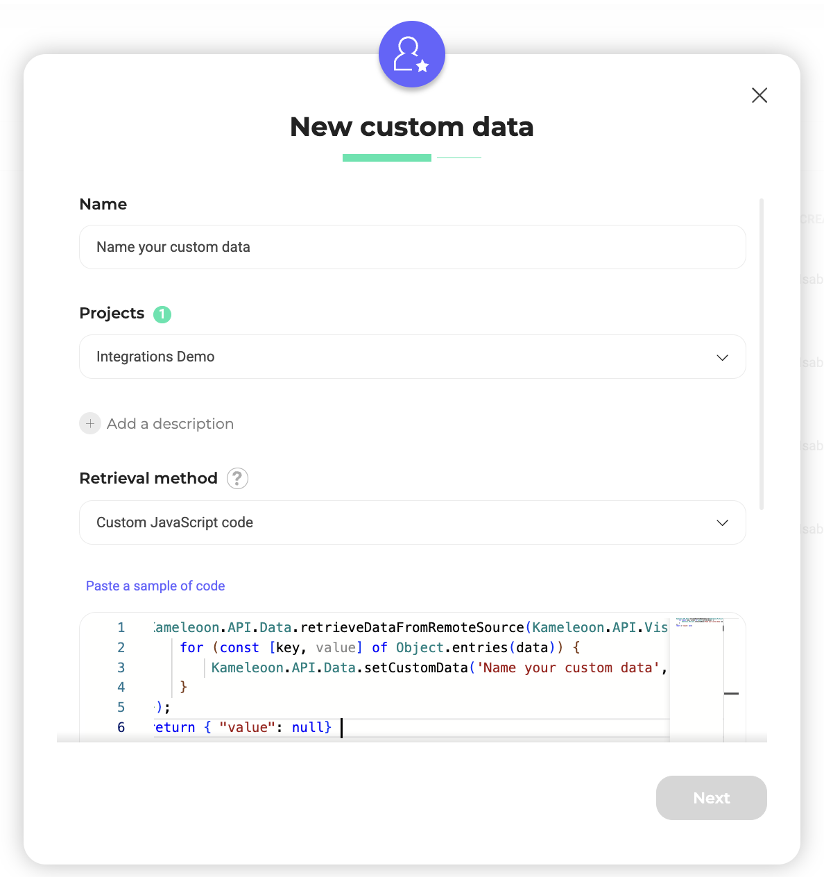 Kameleoon.API.Data.setCustomData('NAME_OF_YOUR_CUSTOMDATA',key)