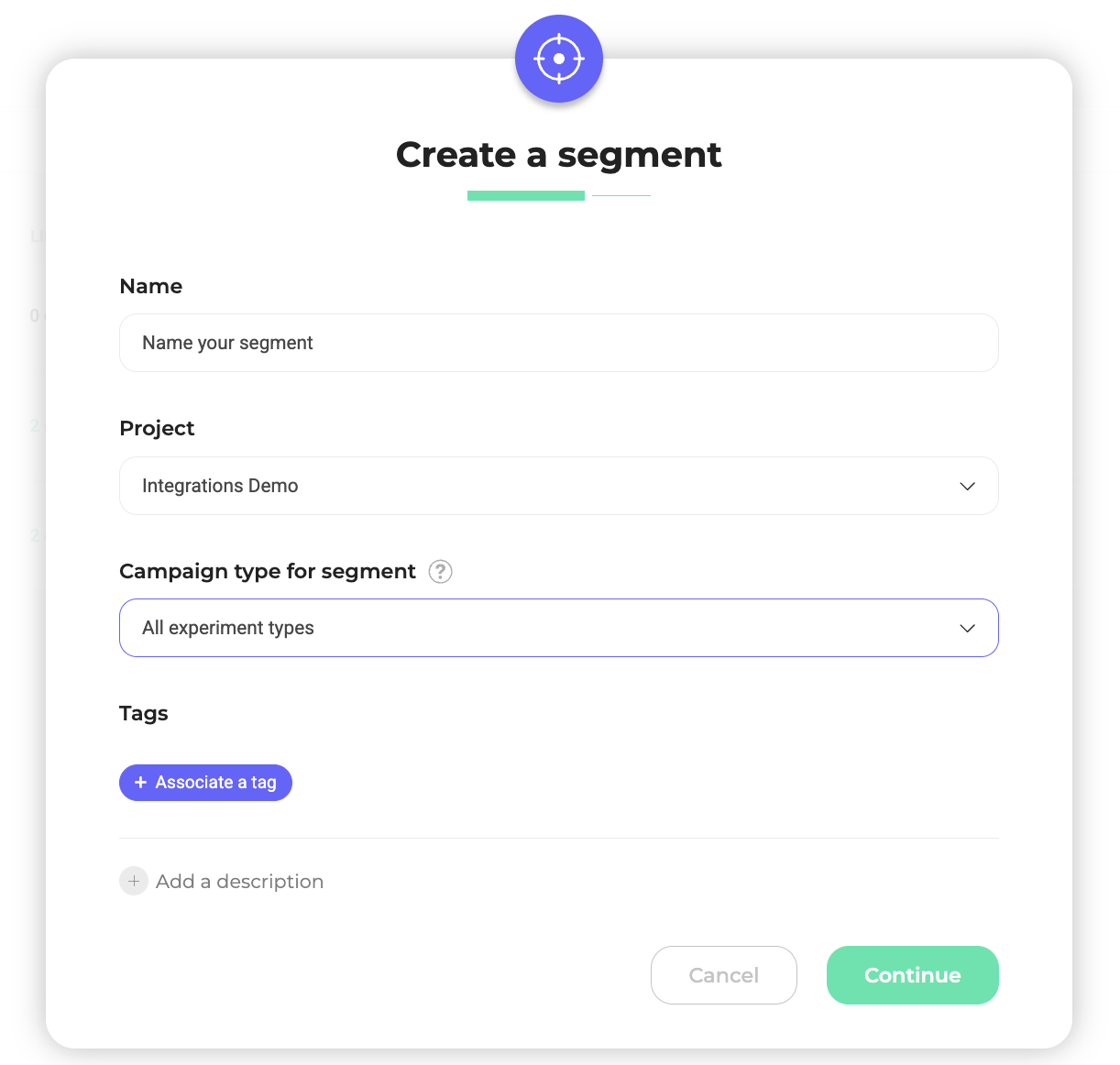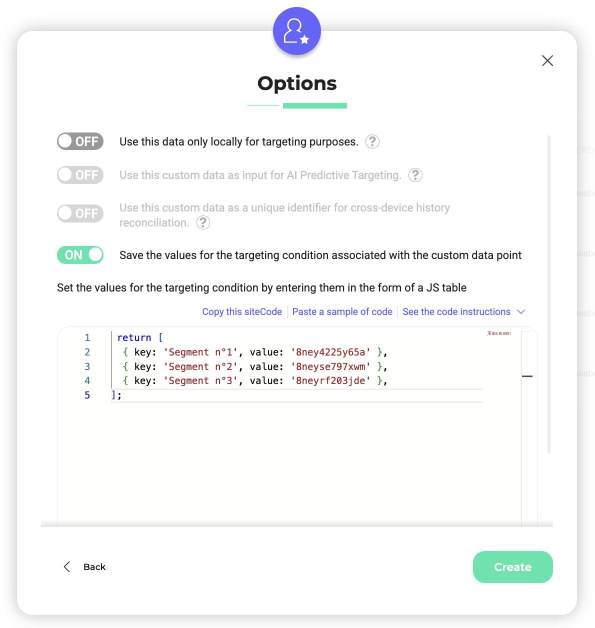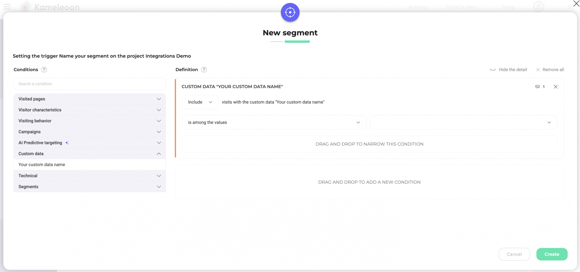 After you've set up the custom data, you can build segments in the Kameleoon Segment Builder. Choose the custom data and select is among the values, which will then display a list of every user data from your third-party tool. Select a user data to enable targeting in personalizations and experiments.