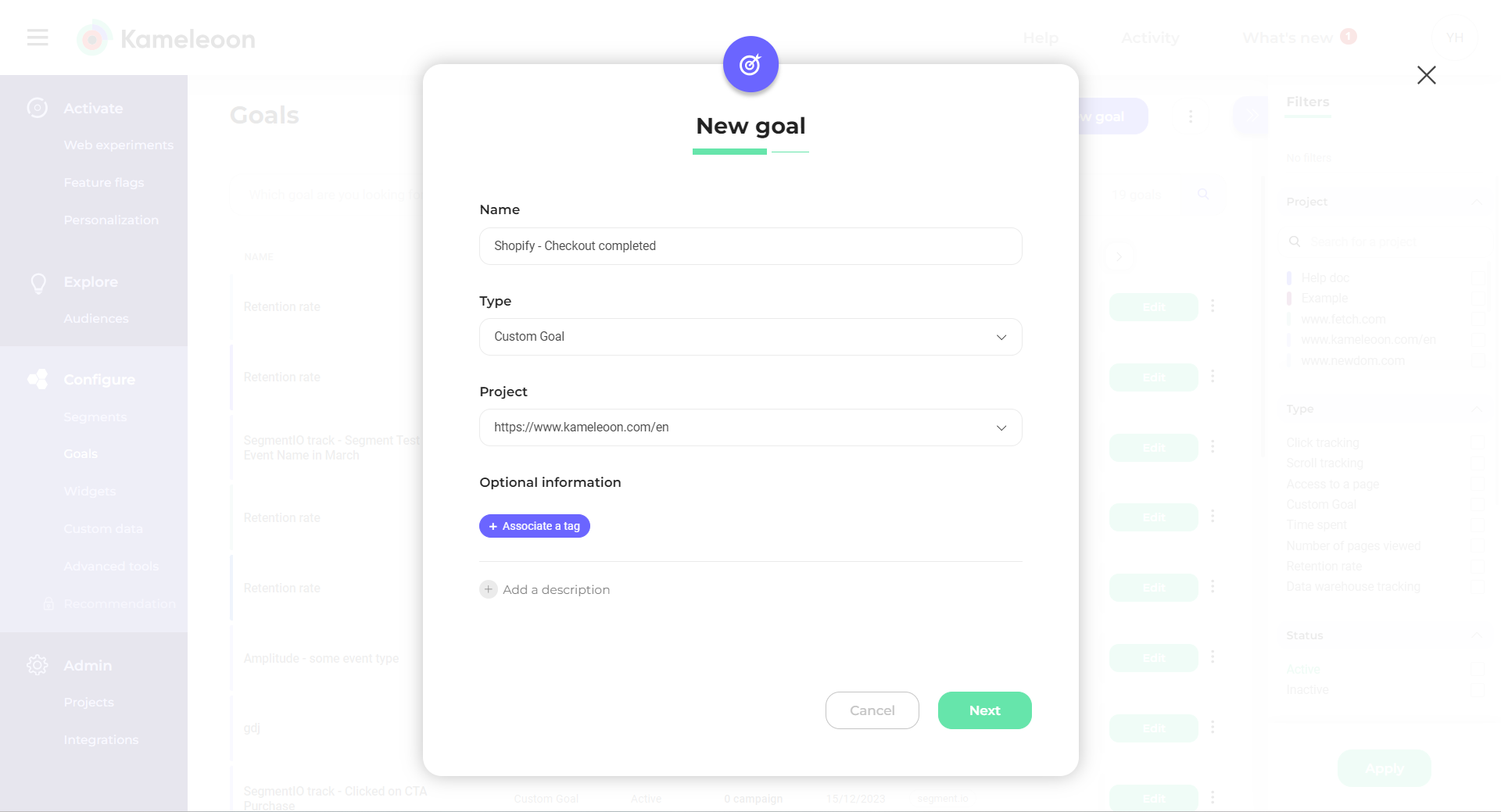 - Select the same project that is used in the Kameleoon snippet you installed on your Shopify store.