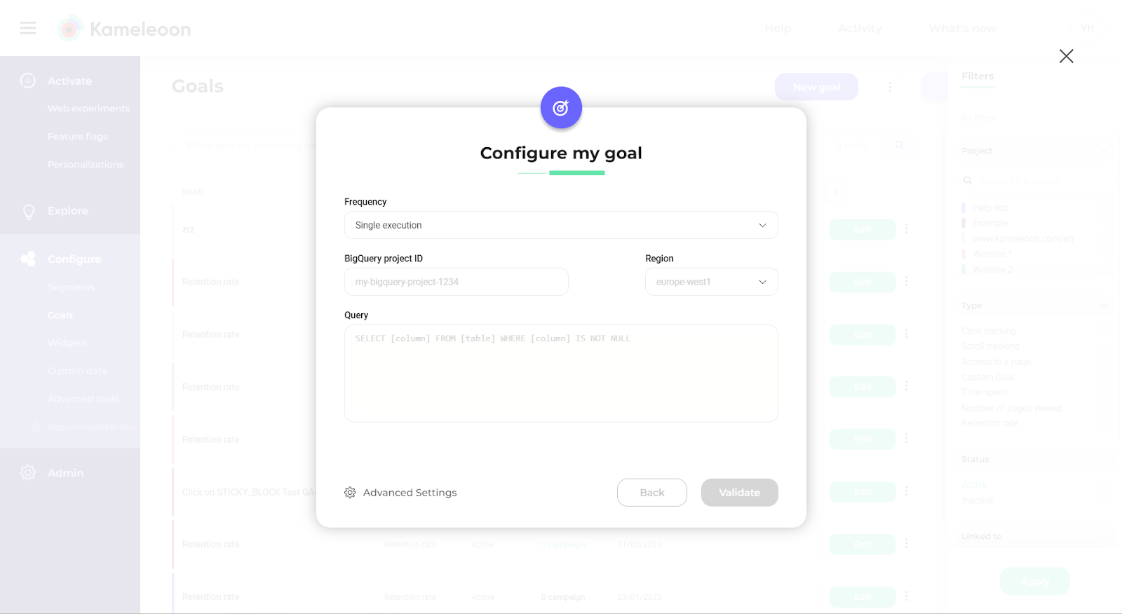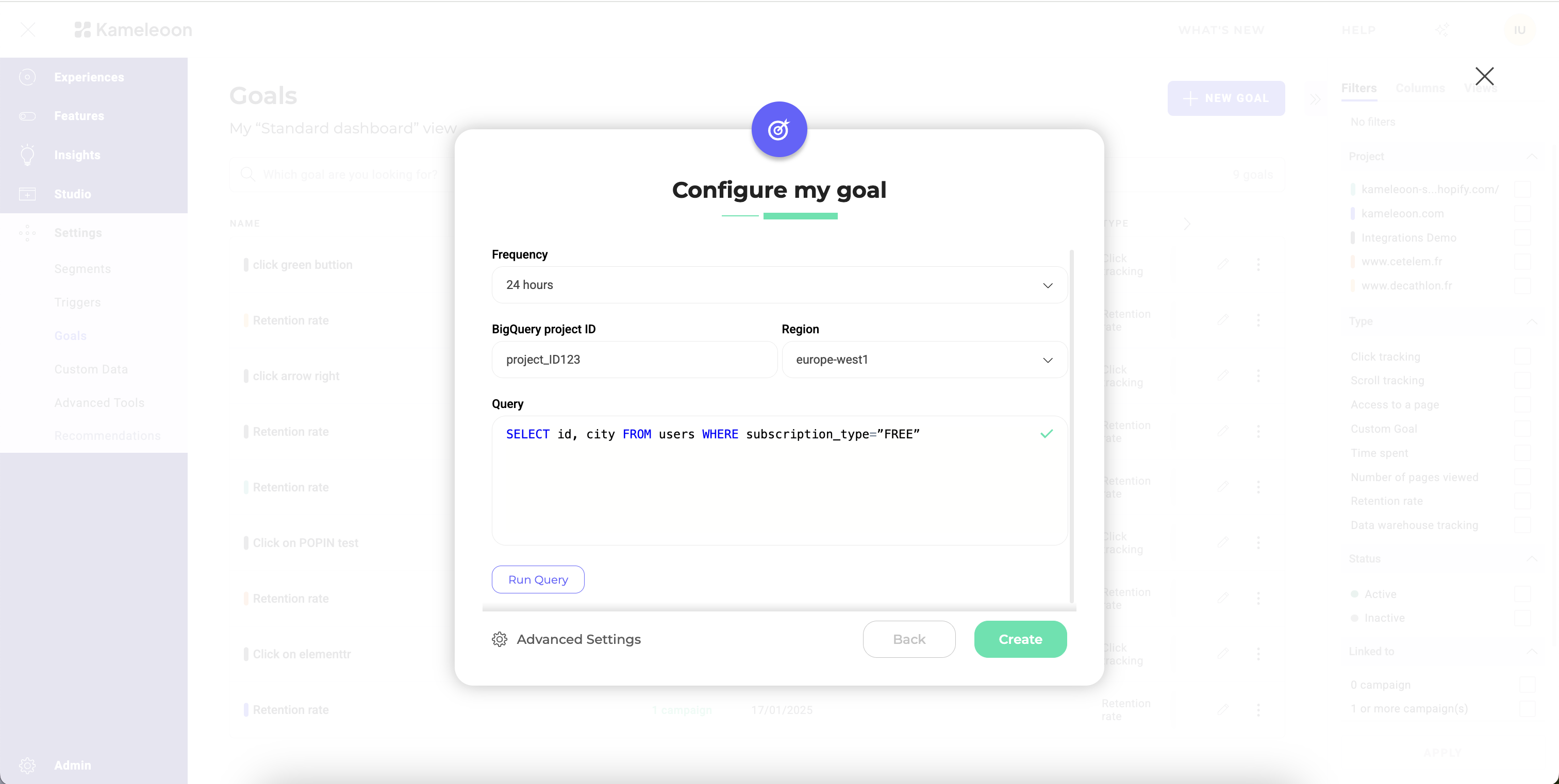 Once you've activated BigQuery for a specific project, you can use it to create goals in Kameleoon. These goals are designed to use conversions data from your BigQuery database. Here's how to create a goal using BigQuery: