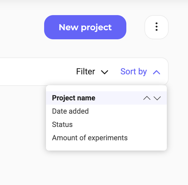 You can also sort projects by name, date added, status, or number of associated experiments. You can switch between ascending and descending order by clicking the arrows to the right.