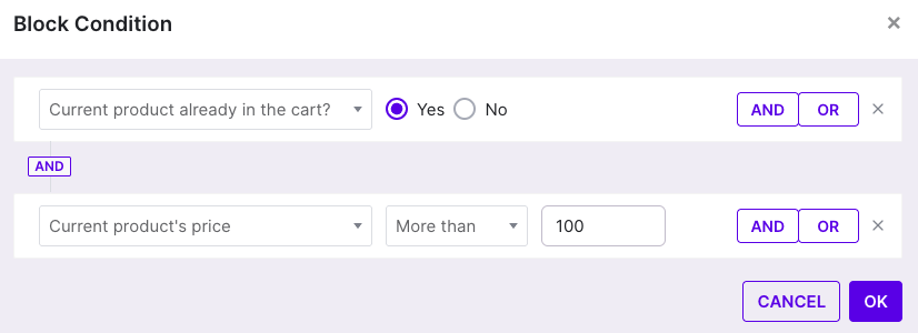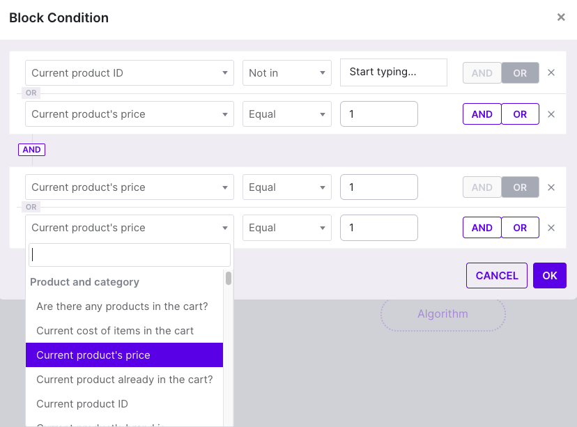 Due to the "top to bottom" logic, a condition is applied to the next algorithm (the algorithm under the condition). For example, in the image below, if the product is more than $100 and in the cart, the user will see other popular products. If not, the user will see similar products.