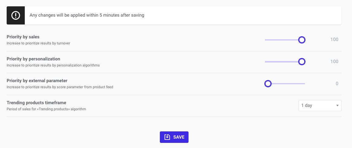 Moving this slider to the right increases the ranking of products with higher sales rates in recommendations.